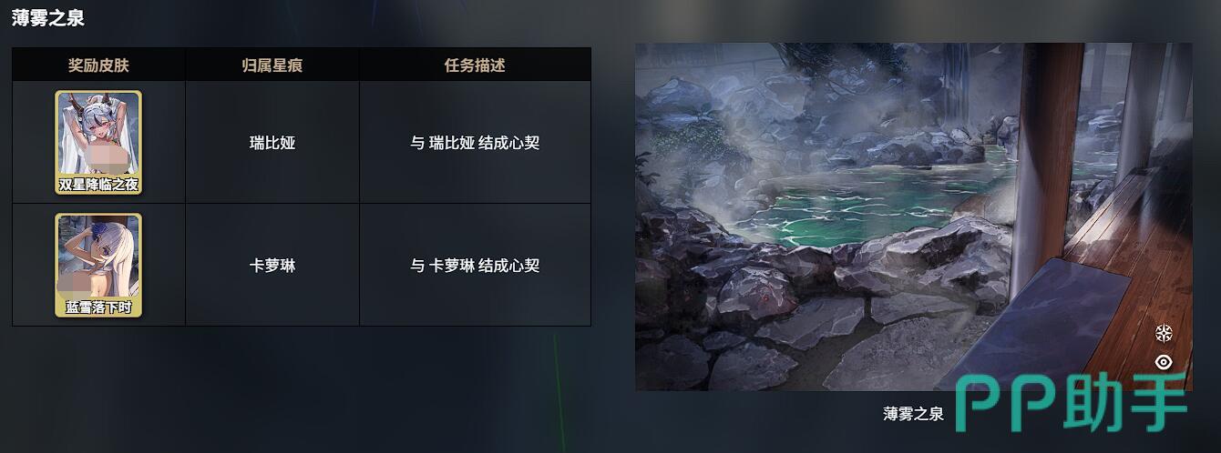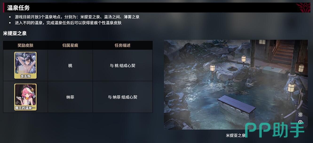 温泉系统中包含三大特色温泉地点:米提亚之泉、温汤之间和薄雾之泉,每个温泉对应不同的星痕角色及任务要求。例如,米提亚之泉与桃、纳菲相关,玩家需与她们缔结心契才能解锁含玉钩和魔王请帖皮肤。心契解锁流程分为两个阶段:首先需通过战斗协同或赠送礼物(如七色铃兰、千纸鹤)将星痕好感度提升至5级,随后在温泉场景中触发专属剧情,选择正确对话选项即可完成心契。解锁的皮肤可在星痕-外观界面自由切换,部分皮肤还能提供战斗中的属性加成。