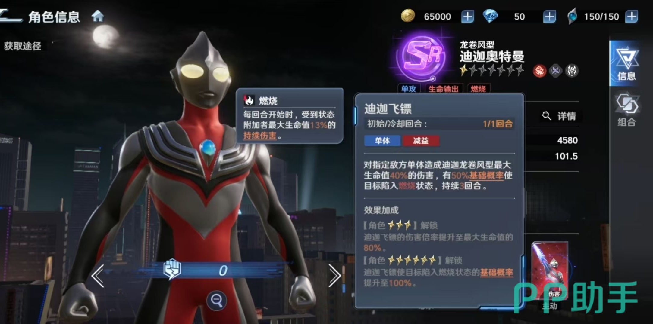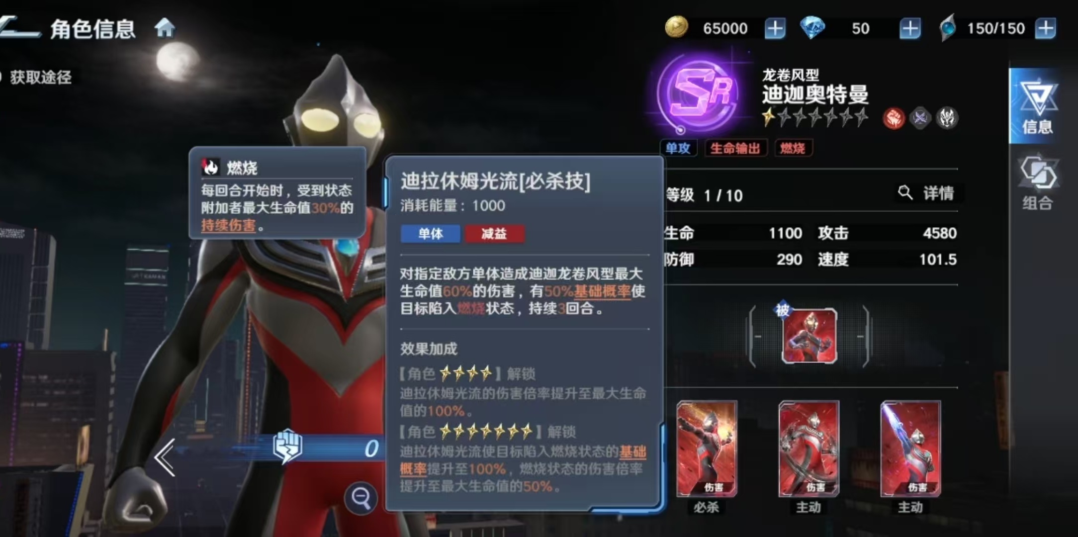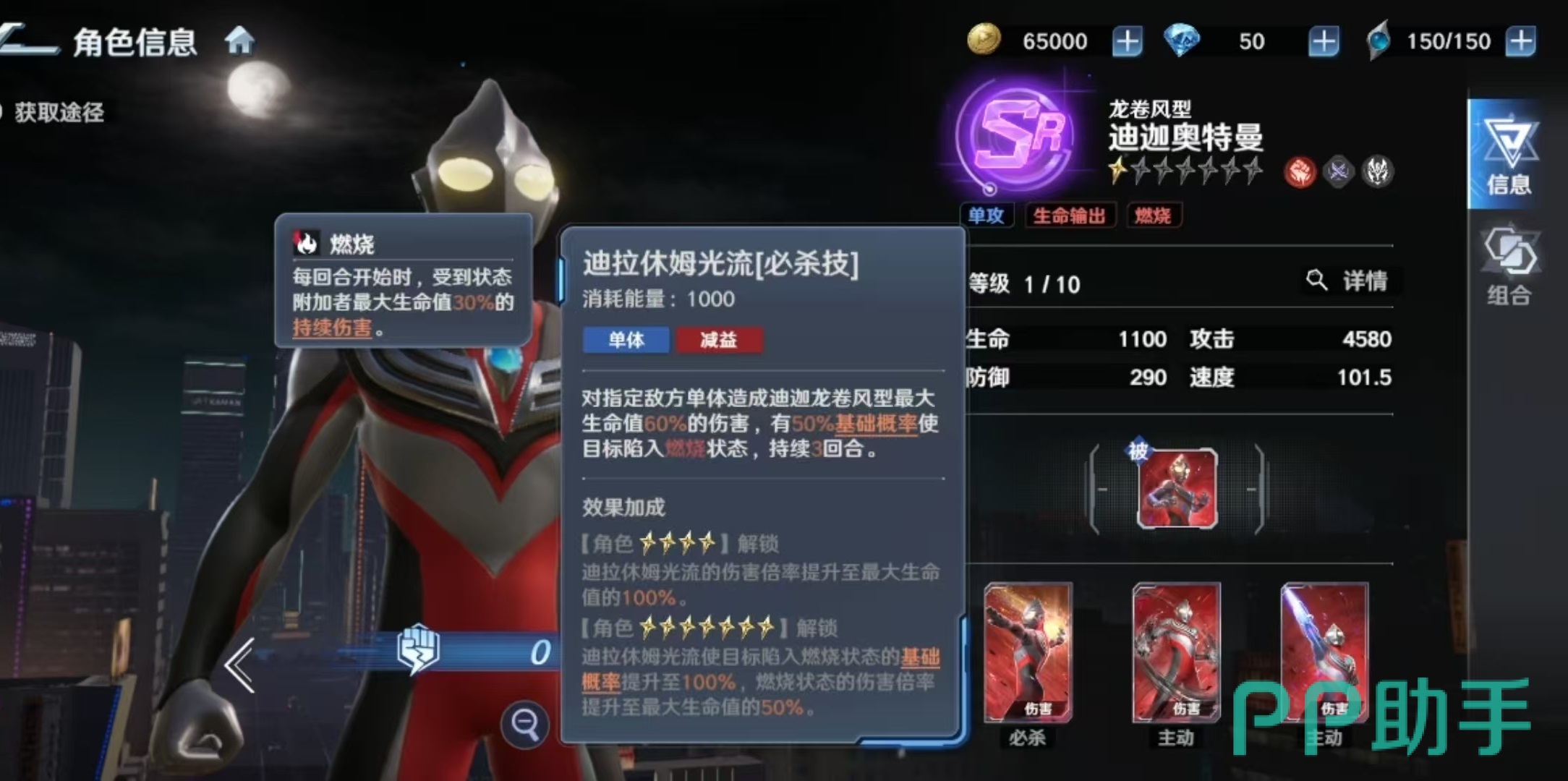 其必杀技具备双重打击逻辑:对单体目标造成相当于其最大生命值60%的真实伤害,并附带燃烧状态概率判定。若成功施加,目标将在接下来三回合内,于每回合初始阶段额外承受施放者最大生命值30%的持续伤害。随着技能等级提升,伤害倍率、燃烧触发基础概率及每段燃烧伤害均同步增强,整体输出总量可观,但瞬时爆发能力相对平缓。