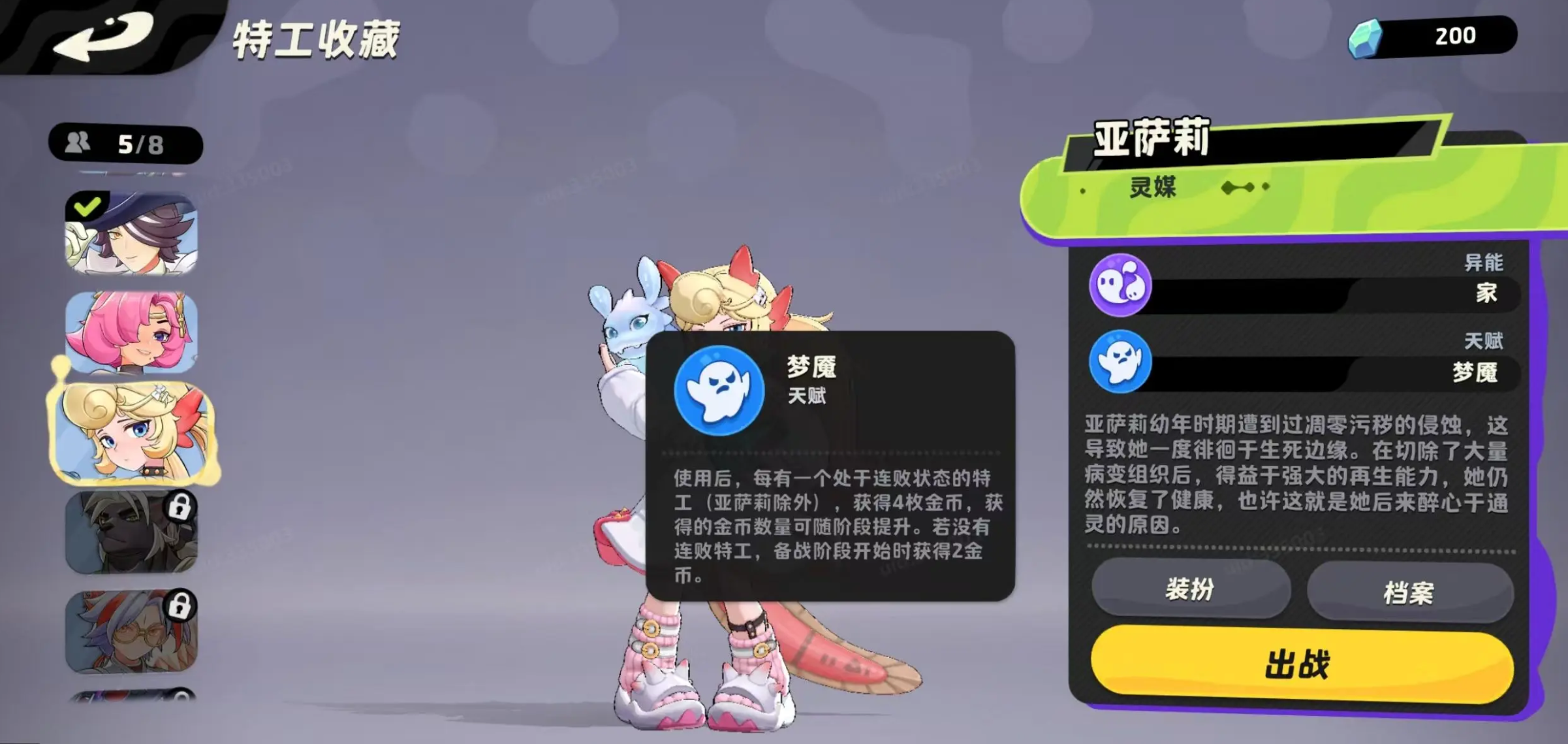 亚萨莉:一位专注于通灵术研究的角色,童年时期曾受凋零侵蚀影响。随着成长,她成功摆脱了病症,并逐渐恢复强大生命力。这段经历使她对生命与灵界之间的界限产生浓厚兴趣。在队伍中,她主要承担战术支援职责,为队友提供关键辅助。