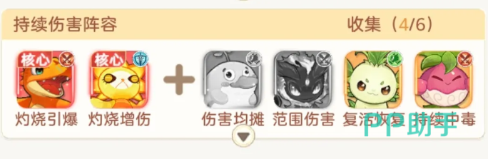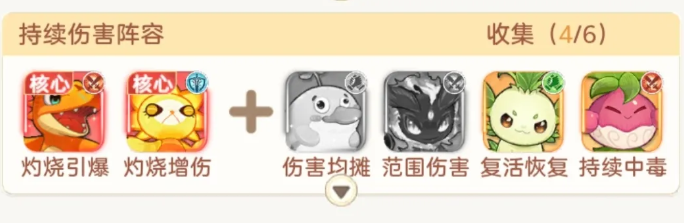 辅助位配置上,鸭宝担任前排承伤与伤害分摊核心,有效延缓我方减员节奏;进化后还可提供额外治疗,保障灼烧层数持续叠加。焰影儿补充AOE清场能力,绿叶宝提供关键复活保障,务必在适当时机使用其复活技能;孢子草则以中毒效果与灼烧形成多维持续伤害叠加,延长敌方受创周期,进一步放大火系真伤收益。