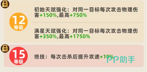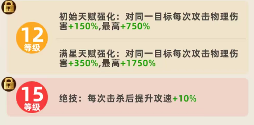 等级成长进一步强化其作战效能。当角色升至9级时,绝技额外提供25%攻速加成,契合射手对出手频率的核心需求;到达12级后,天赋加成同步跃升:单次攻击对同一目标的物理伤害提升至150%,理论上限扩展至750%;满星状态下的对应数值则分别提升至350%与1750%。这意味着,在理想配置下,后羿不仅拥有顶级面板数值,更能通过等级与星级协同释放指数级伤害潜力。