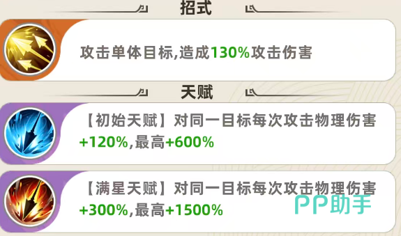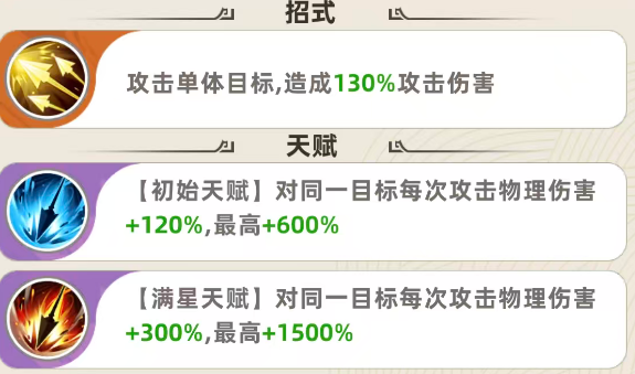 后羿的核心机制围绕“连续命中同一目标”展开。初始天赋触发后,后续普攻将附加120%物理伤害加成,显著高于多数红色品质武将常见的30%–40%区间增幅。该效果具有成长性:满星状态下,单次攻击可叠加至300%物理伤害提升;理论最高上限可达1500%,形成极具压制力的持续输出节奏。