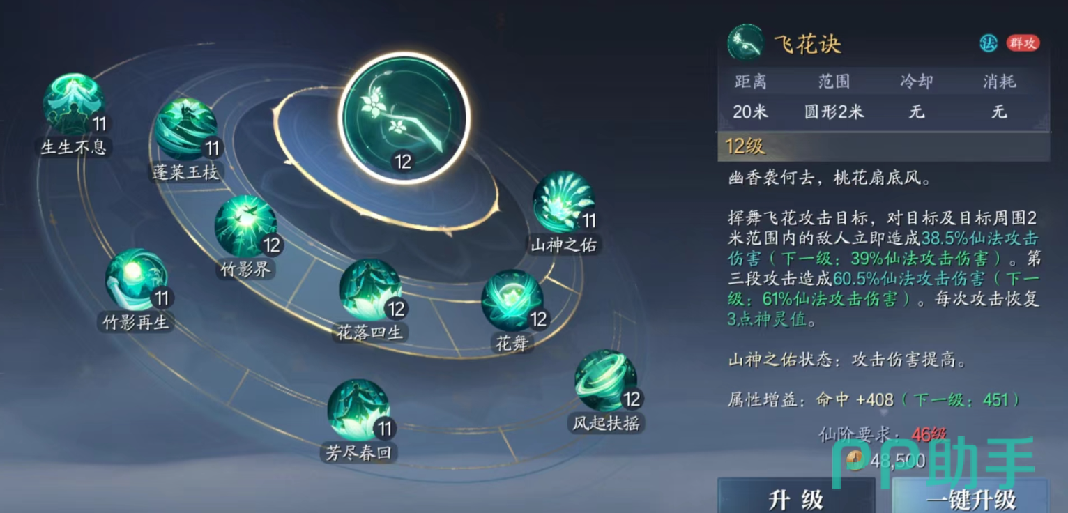 技能“花舞”能够对半径3米内的敌方单位造成仙法伤害并附加击飞效果;在强化状态下,该技能将变更为“风起扶摇”,向前方释放一道高速移动的龙卷风,路径上的敌人会受到多次伤害和浮空控制。而“花落”则是一个单体治疗技,可为目标队友回复一定量气血,同时自动将等额治疗效果转移给当前生命百分比最低的另一名队友,实现智能救援。