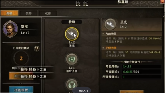 接着还可以看一下技能,祭祀主要的技能都是以辅助为主,在技能界面的右下角救赎栏中就能看到圣光,这就是一个相对比较少见的攻击技能,可以直接造成范围性神圣伤害。而其他的那一些技能,例如治疗术、神复活、回复术、解毒圣言要么是恢复队友的血量,要么是解除负面的效果。