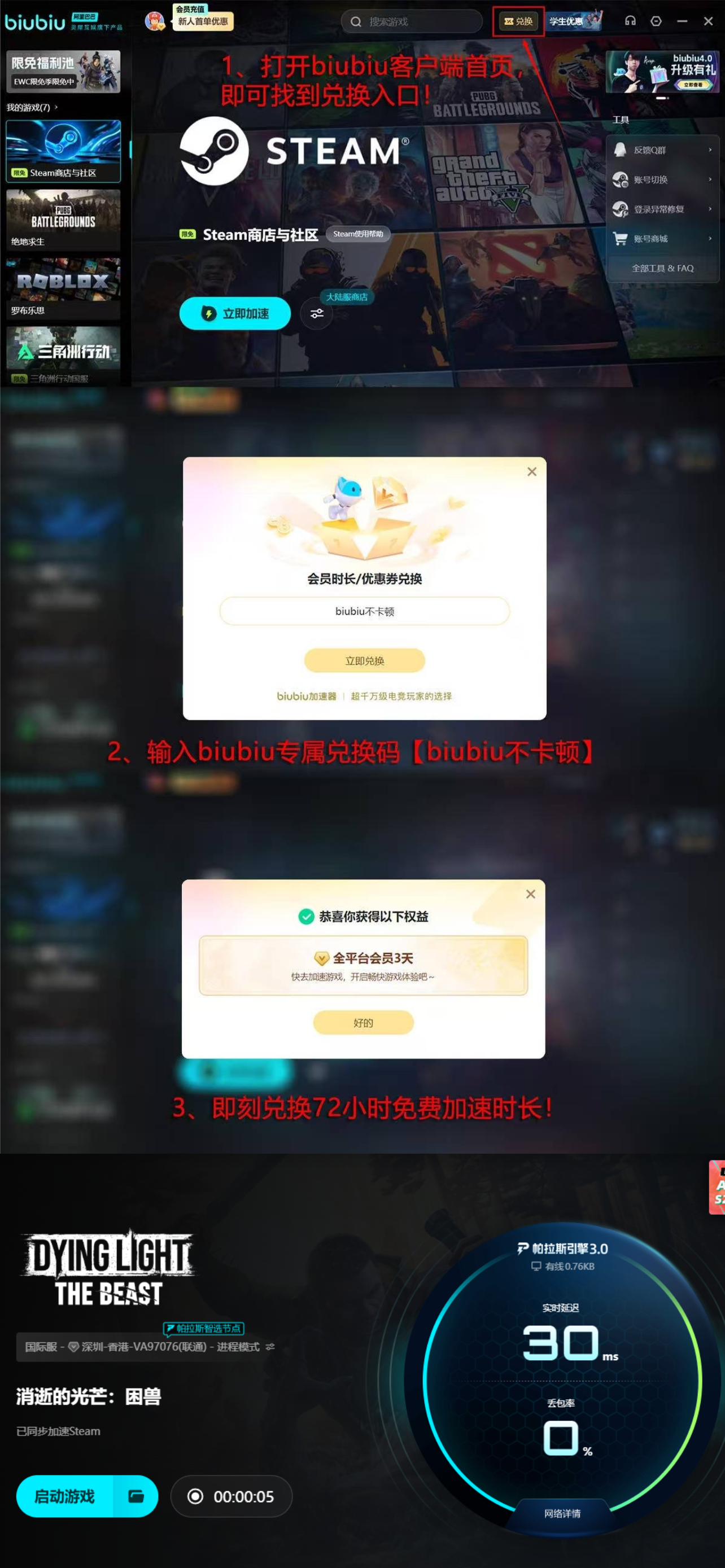 文中推荐的加速工具为玩家提供了便捷的网络优化服务,新用户完成注册后将自动获得24小时免费使用时长,无需复杂操作,即时生效。同时,输入专属口令【biubiu不卡顿】还可额外领取72小时免费时长。结合首注册福利,新用户最多可享受累计96小时的免费加速体验,充分测试网络稳定性后再决定是否续用。