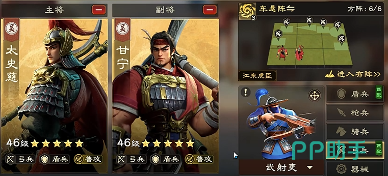第一套为甘宁与太史慈为核心的暴击速攻流。该组合以极致的速度压制和爆发伤害著称。甘宁凭借其天生高暴击属性,搭配太史慈稳定的多段输出能力,形成持续高压打击。两者共同激活“江表虎臣”羁绊后,全队暴击率显著提升,再配合武射吏兵种提供的额外暴击加成,输出效率大幅提升。阵法方面推荐使用车悬阵,可在攻击后免疫反击伤害,有效规避敌方反制;若面对高爆发对手,“袭军”或“强袭”阵型也能增强先手压制力,实现快速斩杀。
