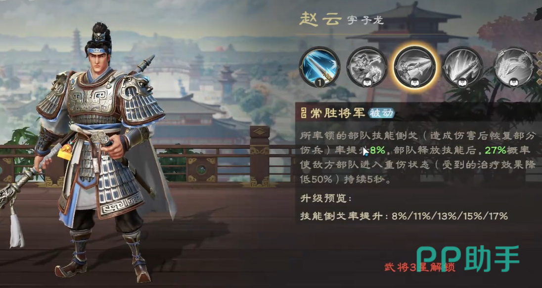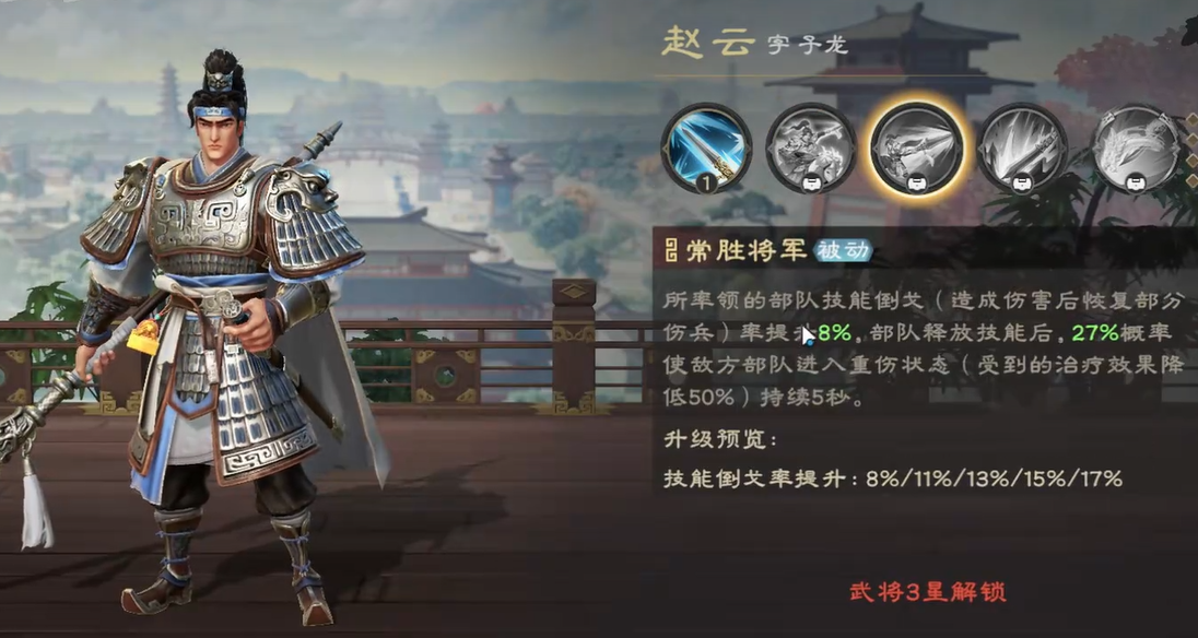 第三套是以赵云为主C的暴击爆发阵容,辅以公孙瓒提供增益支持。赵云作为核心输出点,拥有极强的单体爆发能力和稳定攻击模式,是暴击流派的理想人选。公孙瓒虽无专属强力羁绊,但其技能可全面提升团队暴击率与技能伤害,极大放大赵云的输出潜力。搭配禁军兵种后,不仅能享受击飞特效带来的打断效果,还能进一步提升暴击属性。阵法上建议选择双龙阵或七星阵,完美契合赵云的进攻节奏,最大化其战斗效能。对于新手而言,公孙瓒作为紫卡武将获取难度较低,性价比突出。