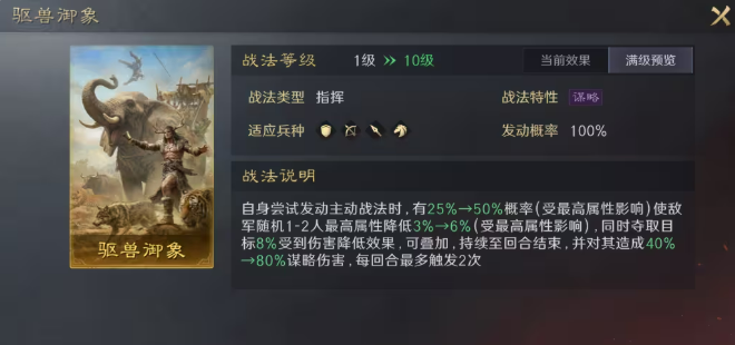 其战法具备三重战术效果:随机选取一至两名敌方目标,降低其最高属性6%(可叠加);同步夺取目标8%减伤效果转移至己方,相当于为敌方施加8%易伤,并附加一段谋略伤害用于破除抵御。单回合理论最大覆盖为两名目标各触发两次,合计达成双目标16%易伤+己方32%减伤。触发判定仅需“尝试发动主动战法”,无需实际发动成功,且属性降低效果可激活孟获“借刀”机制。
