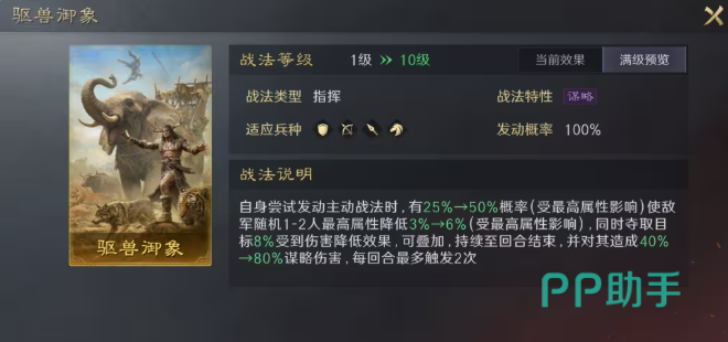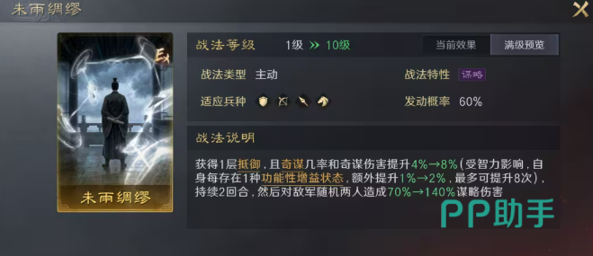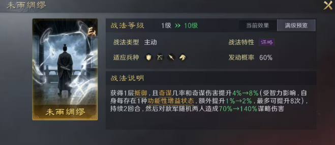 战法【未雨绸缪】专为高智力谋略型武将设计,发动即赋予一层抵御,并同步提升奇谋发动概率与奇谋伤害。其增益幅度随自身功能性状态数量递增,清醒、必中、破御、抵御等均计入叠加基数。与司马懿配合最为契合:布阵叠满8层后,仅保底即可提供24%奇谋概率与奇谋伤害提升,叠加智力属性加成后,整体收益极为可观。