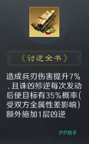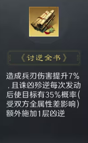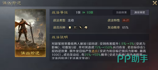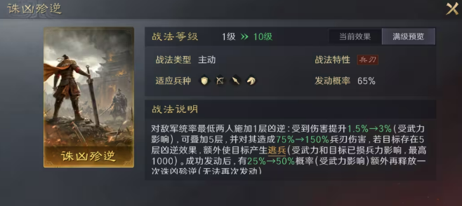 其核心机制围绕【凶逆】状态展开:发动后自动锁定敌方统率最低的两名目标,逐回合叠加层数;叠满3层后,使目标受到伤害提升至少15%,该效果全程持续生效。若搭配战法《讨逆全书》,叠层周期可压缩至2回合,大幅提升压制节奏。该设计直击低统率核心输出或辅助单位,有效绕过高统率武将的减伤体系,对传统高减伤肉盾阵容亦具备突破能力。