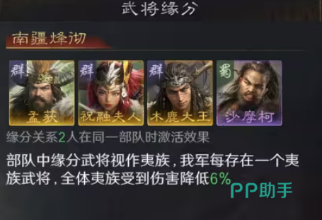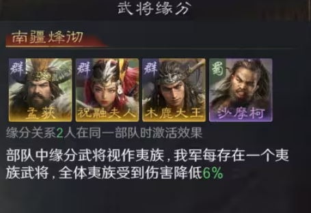 缘分方面,两人即可激活基础效果;三名夷族武将同队时,全队获得18%常驻减伤,等效于额外配置一名曹操级减伤核心;金书解锁后,同步获取减伤强化与兵力回复效果,防御维度全面升级。推荐采用雁型阵+全先攻加点,搭配孟获(借刀)、祝融夫人(兵刃输出),激活“南疆烽烟”后,18%减伤叠加巫医古卷治疗效果,队伍生存与续航能力显著增强。该体系亦可释放诸葛亮资源,拓展多队协同作战空间。