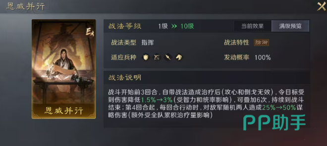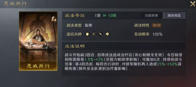 战法【恩威并行】侧重治疗联动体系,尤其适配刘备“薪火枪”思路。当与自带稳定治疗能力的武将组合时,收益最大化。以刘备为例,其每回合稳定触发四段治疗,可充分激活该战法效果:前三回合每次治疗后为目标施加减伤;自第四回合起,每回合对两名目标造成谋略伤害,且伤害量额外享受全队累计治疗量加成。实现前期生存稳固、后期输出补充的双重功能。