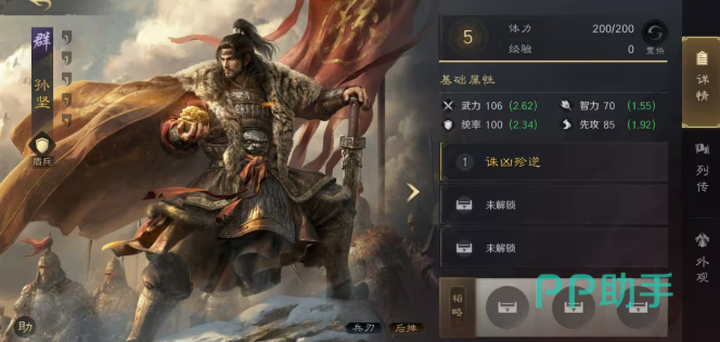 群·孙坚定位为高爆发兵刃型主将,武力初始值106,成长率2.62;统率起始100,成长2.34,具备稳定前排承伤能力;先攻85,在主流输出武将中属上位水平,显著快于王异、陆逊等常见谋略核心。兵种为盾兵,对阵弓兵时拥有天然克制优势,但需规避骑兵高强度突击阵容。