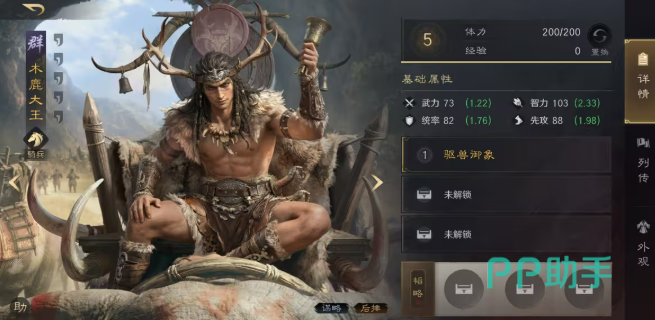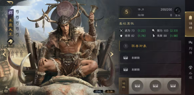 木鹿大王为智力型辅助武将,智力初始103,成长2.33;统率82,属中等承伤水平;先攻88,适配全先攻加点以抢占主动权。兵种为骑兵,对盾兵具备抗性,但对阵姜维、王异等枪兵时需谨慎应对。