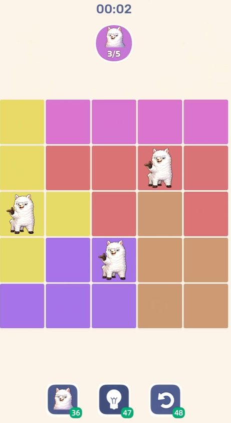 游戏采用经典约束型逻辑布局机制:棋盘由多色区块构成,每行、每列及每种颜色区域均限放置一只羊驼;同时,所有羊驼之间禁止相邻——包括上下、左右及四个对角方向。在严苛但清晰的规则框架下,玩家需通过排除法、唯一候选等逻辑技巧,推导出每个羊驼的唯一合法落点,体验层层递进的解题快感。