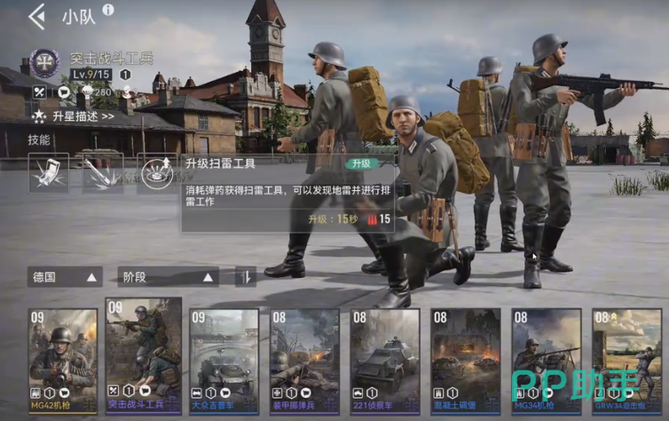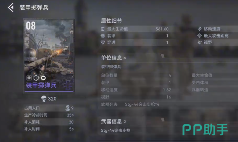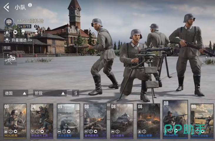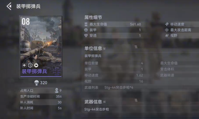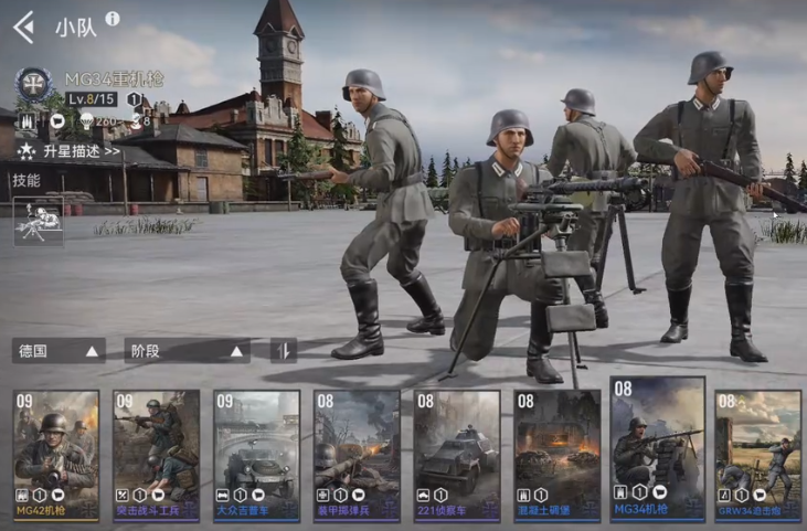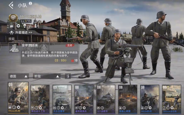 游戏里会设置几个不同的国家,因为篇幅有限,这一期会以德国的兵种为例跟大家分享,德国步兵种类相对来说是比较少的,主打的都是一些重型的装甲车辆,首先是里面有步兵,这些步兵会使用mg42重机枪攻击,他们的生命值是比较高的,并且射程也很远,虽然角色的生命值不高,但对于步兵来说是完全够用的,这个兵种有一个比较独特的技能,就是战斗到底,步兵会以5人小组的形式呈现,队伍里每少一个步兵成员,整个队伍就会额外获得伤害减免的效果,这就表示队伍的成员会越来越厉害,尤其是最后一名成员,通过设定的加成,会拥有极高的血量。