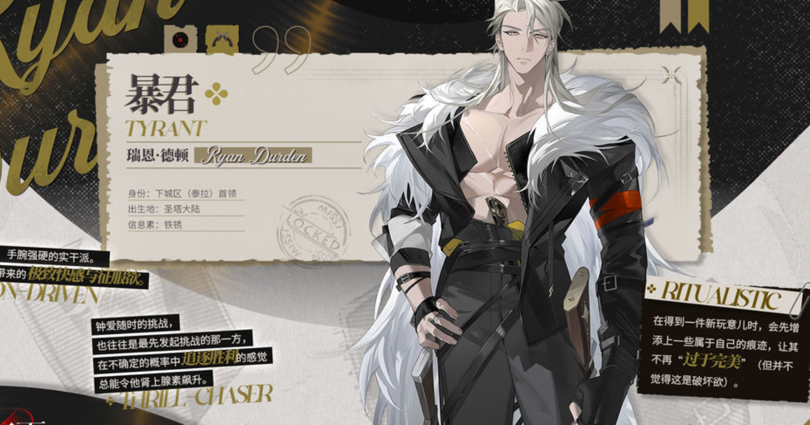 视觉层面,暴君以高辨识度的造型确立存在感:银白色长发在低饱和度的暗夜场景中形成强烈明暗对比;肩甲厚重、轮廓硬朗,配合压迫感十足的站姿与镜头调度,营造出“空间凝滞”的沉浸式出场效果。这种设计并非单纯强调威慑力,而是服务于角色符号化表达——他是秩序崩塌后重建规则的执行者,也是玩家在混沌叙事中可锚定的具象支点。