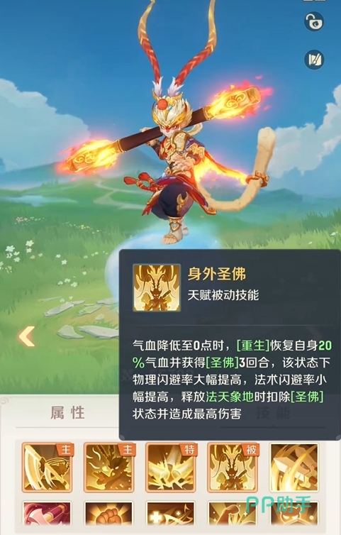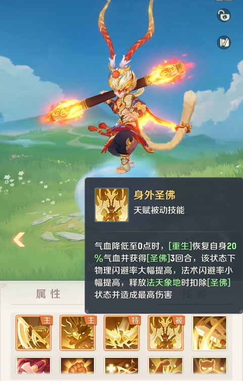 实战层面,孙悟空定位清晰:高爆发物理单体输出手,兼具临界反杀能力。其核心被动“身外圣佛”在气血归零瞬间触发,立即恢复20%最大气血,并进入圣佛状态——该状态下,物理闪避与法术闪避同步提升,且释放主动技能“法象天地”时,伤害必定达成理论最高值,完全规避暴击率、抗性、减伤等变量干扰,成为逆转战局的关键底牌。
