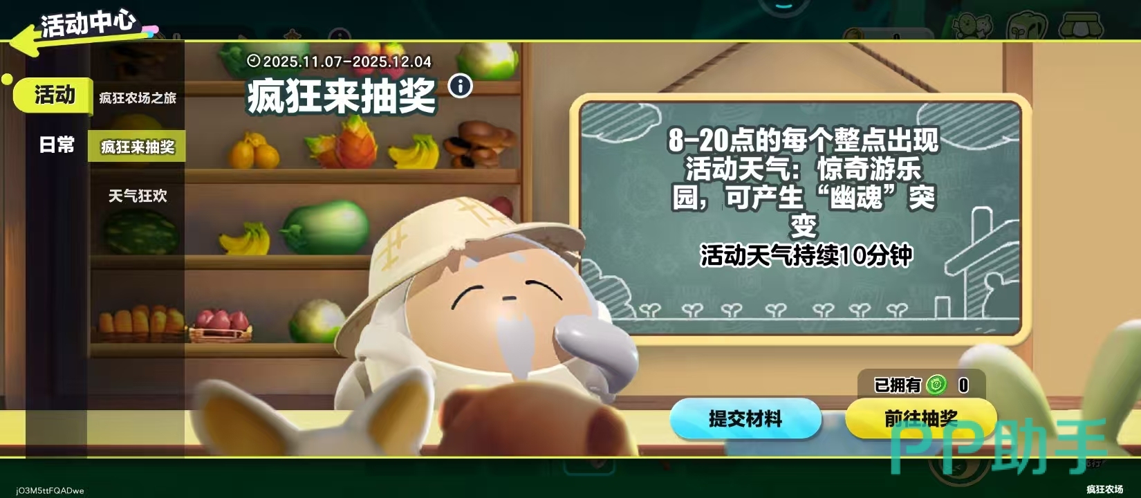 参与抽奖需要消耗积分,而积分的主要来源是全新天气事件——惊奇游乐园。这一特殊天气每日固定在20:00至20:10之间出现,持续时间仅有十分钟,因此玩家需提前准备并准时进入农场等待。当天气降临后,所有已成熟的农作物将触发幽魂突变,收获变异果实并提交给田园阿公即可获得抽奖积分。建议设置闹钟提醒,避免错过关键时间段,确保稳定积累积分。