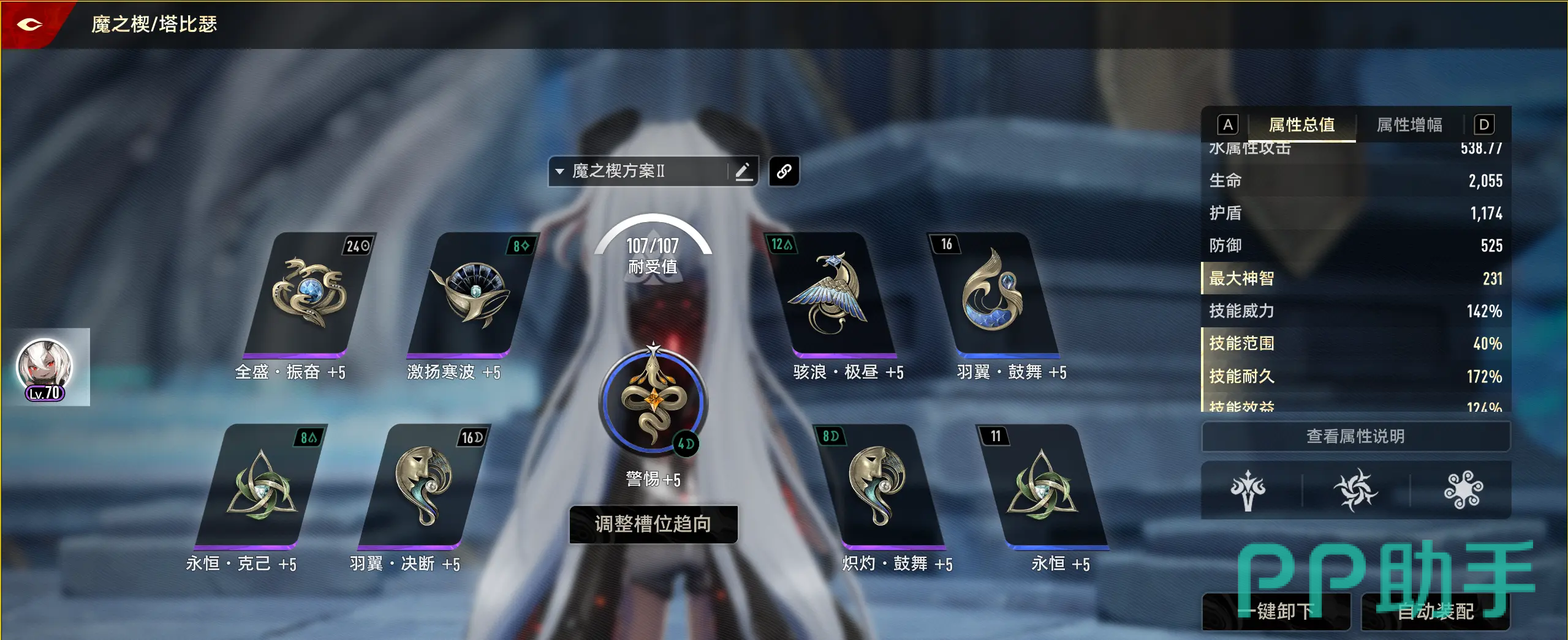 在配置魔之楔时,必须重视槽位匹配度与耐受值消耗之间的平衡。为塔比瑟进行装配时,应遵循“角色主属性优先,其次远程武器,最后近战武器”的顺序原则,并围绕她通过召唤触手叠加暴击的核心机制展开构建。“全盛·振奋”和“激扬寒波”属于必备选项,作为辅助型技能,能有效为全队提供增益状态,显著增强团队输出能力。此外,“骇浪·极昼”与“羽翼·鼓舞”也具备很高的适配性,推荐优先装配。具体搭配方案可参考下图所示组合,注意只有正确匹配对应模块,才能激活额外加成效果。