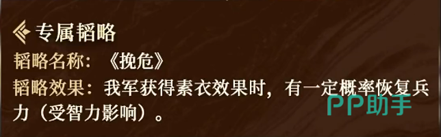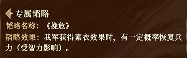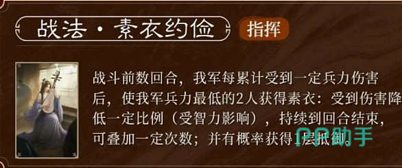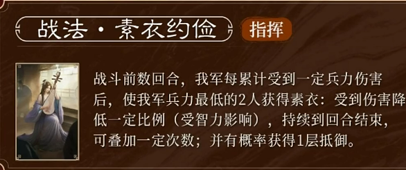 卞夫人的核心技能名为“素衣约检”,该技能拥有特殊的触发条件:需在我方部队于战斗前期承受一定兵力损耗后,方可激活“素衣”状态。一旦触发,系统将自动为当前兵力最低的两名友方武将附加减伤效果,降低其所受伤害比例。该减伤数值与卞夫人的智力属性直接挂钩,智力越高,提供的减伤越强。尤为突出的是,此减伤可多次叠加,并且持续至战斗结束,极大增强了队伍整体的续航能力。