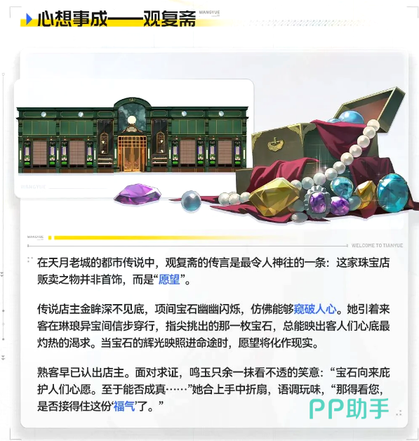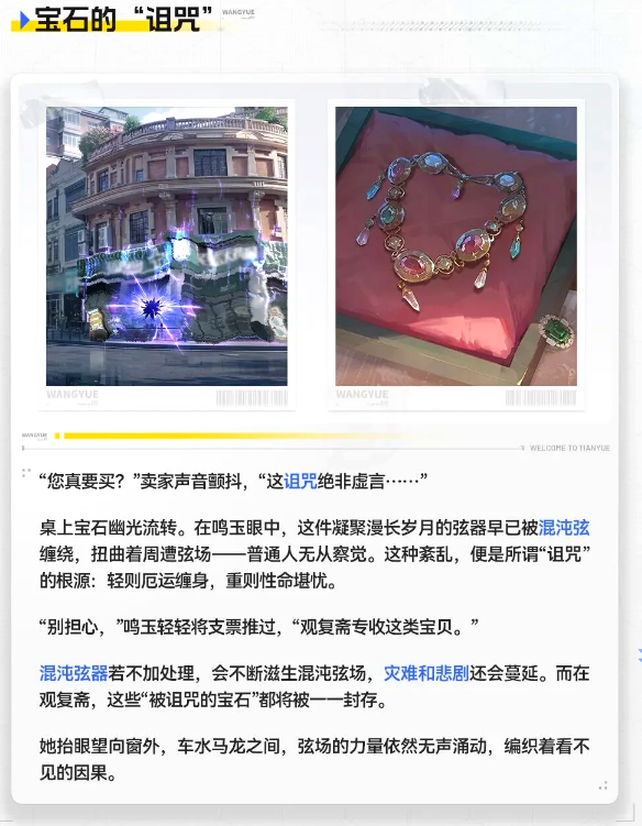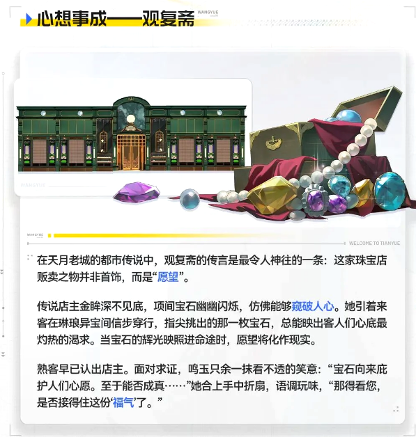 观复斋作为天悦城内历史悠久的灵器工坊,鸣玉以店主身份掌握独特能力:可感知来访者深层心愿与情绪波动,并将抽象愿望凝练为具象祝福,最终承载于特制珠宝之中交付使用者——这正是“许愿成真”传说的来源。此外,她具备高阶净化权能,可清除受污染或附带诅咒的宝石能量,阻断负面灵能扩散路径,是保障整座都市安全运行的关键屏障之一。