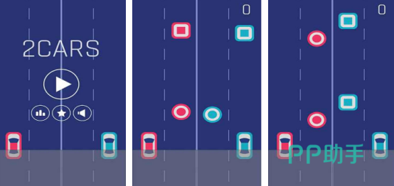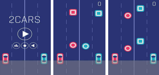 以汽车竞速作为主要元素,游戏中涵盖两种不同颜色的汽车,分别有红色以及蓝色。在开局后,两位玩家可各自选择一种自己喜欢的汽车,通过利用手指操控的方式,让小汽车顺利向前,但是在赛道上也会随机出现不同的障碍物,玩家可结合障碍物的具体颜色决定是否碰撞,因为在碰撞之后,也可获得相应的分数,两位玩家可通过同频操作的方式相互较量。