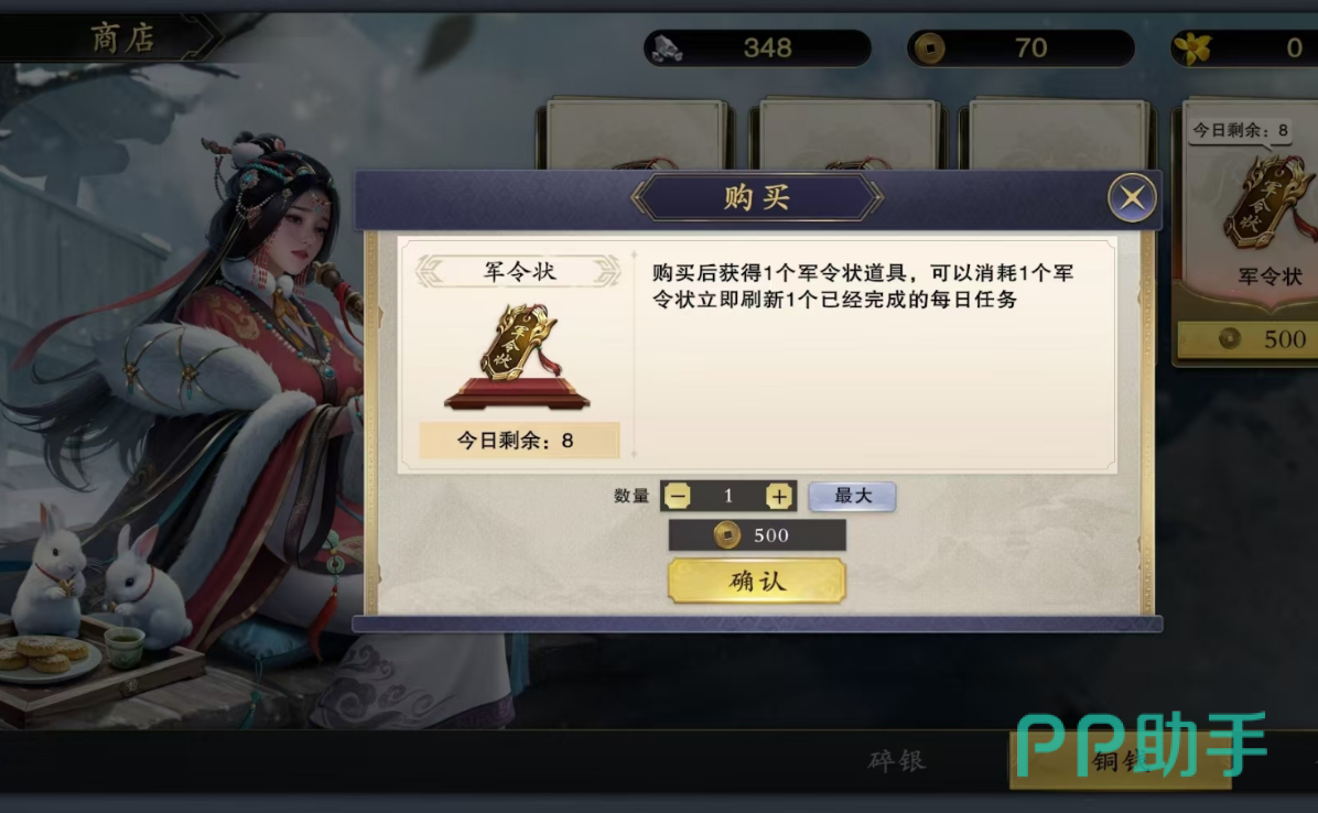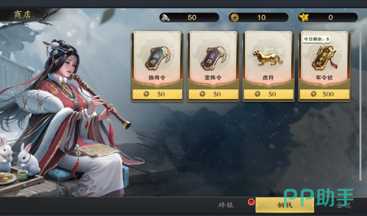 获取到的铜钱主要用于兑换铜钱商店中的功能性道具,这些道具直接影响玩家的游戏体验与战术执行能力。商店内主要分为四类商品:军令状、变阵令、换将令和虎符。其中,军令状为每日限购类型,适合急需碎银招募新武将的玩家优先购买。使用军令状进行快速副本扫荡后,可一次性获取大量碎银,有效支撑武将升星与技能强化所需资源,进一步推动角色成长进度。