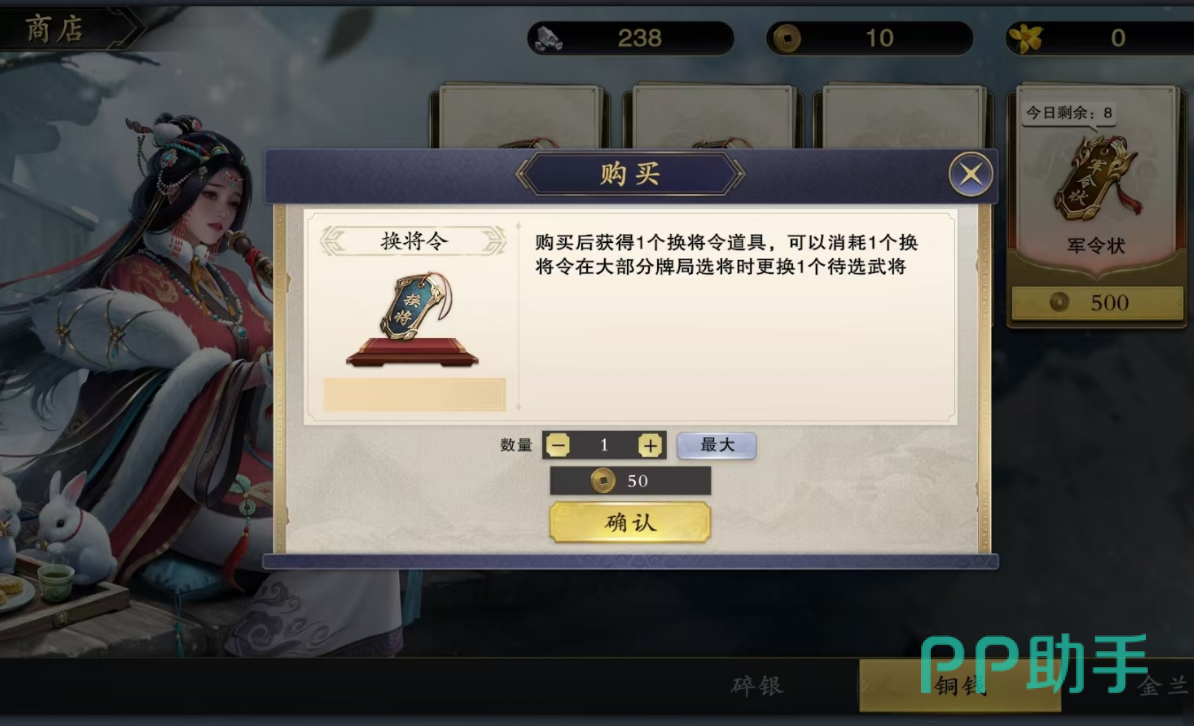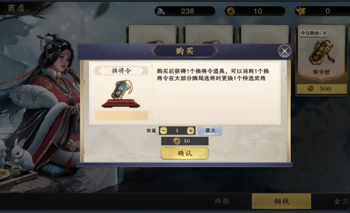 变阵令和换将令同样是铜钱商店中值得重点投入的道具。变阵令允许玩家在战斗过程中调整手牌布局,增强应对突发局势的能力;而换将令则可在关键时刻更换出场武将,实现战术上的灵活切换。这两项道具在高阶排位或复杂对局中尤为关键,虽不限制每日购买次数,但存在使用上限,因此建议玩家根据实际需求合理规划使用频率,避免不必要的铜钱浪费。