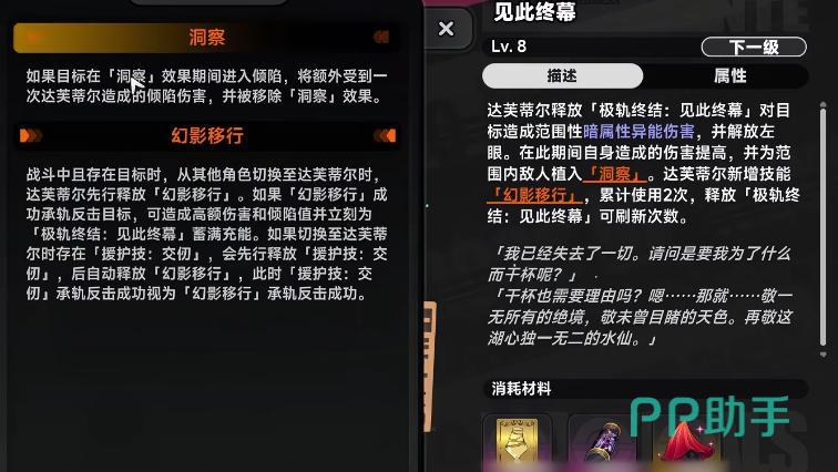 关键机制在于“弹刀联动”:若“幻影移行”成功触发弹刀效果,将立即为大招完成全额充能。这意味着单次循环内最多拥有两次大招释放机会,极大强化了队伍应对高韧性Boss时的节奏掌控力。因此,达芙蒂尔的理想定位是后台倾陷轴核心,配合其他倾陷角色构建协同破韧体系,仅在需要弹刀、补E或触发洞察追伤时短时切入,全程保持高响应性与低驻场比。