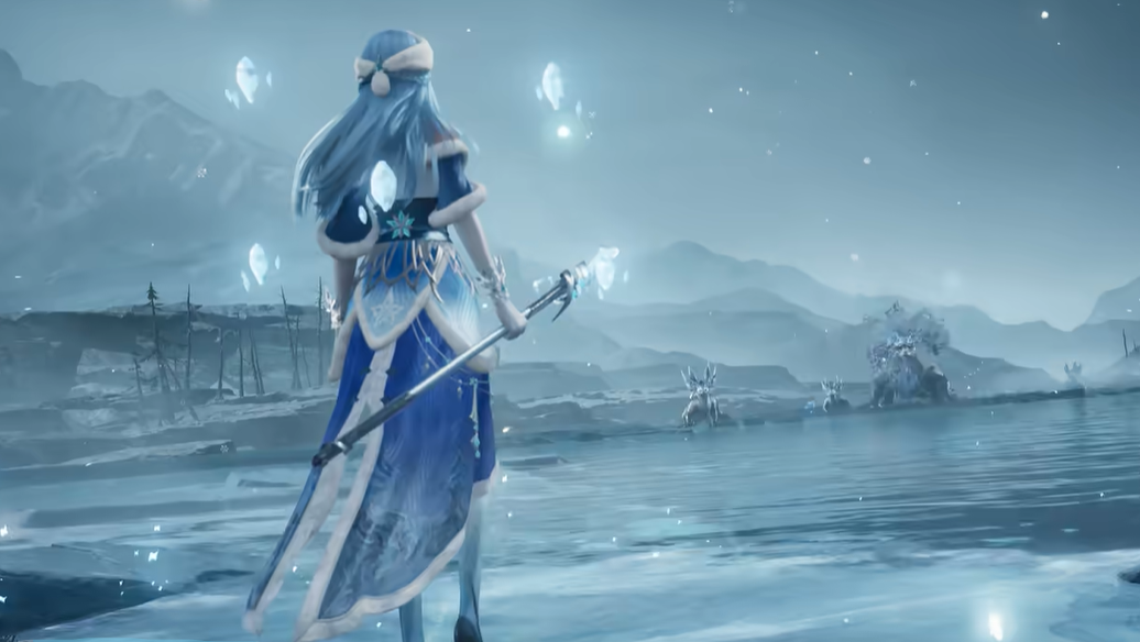 该皮肤以北夷地域文化为叙事基底,整体采用冷调蓝白配色体系,融合冰晶折射、寒梅绽放等核心意象。服饰设计强调身份跃迁——从汉朝和亲使节升华为统御冰雪之力的部族领袖。法杖表面浮现流动冰纹,衣袂随动作自然飘动,配合技能释放时空中浮现的冰晶化梅花瓣,构建出兼具诗意与张力的动态美学。这种视觉语言不仅强化了角色记忆点,更承载了对家国情怀与文化归属的深层表达。