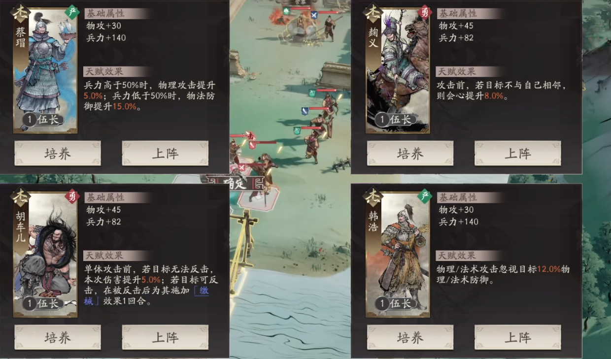 核心天赋:兵力高于50%时,物攻提升5.0%;兵力低于50%时,物法防御提升15.0%。