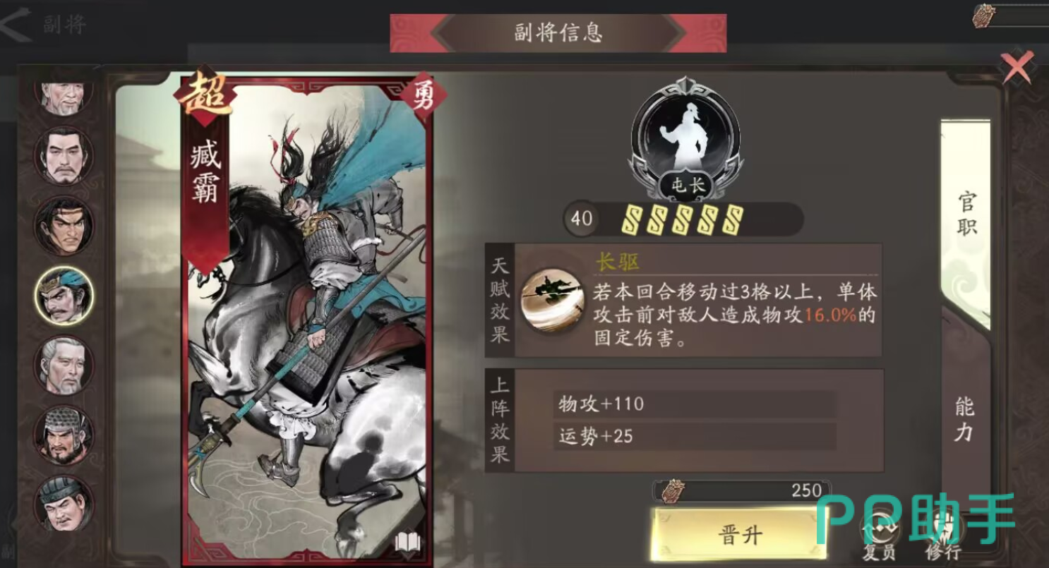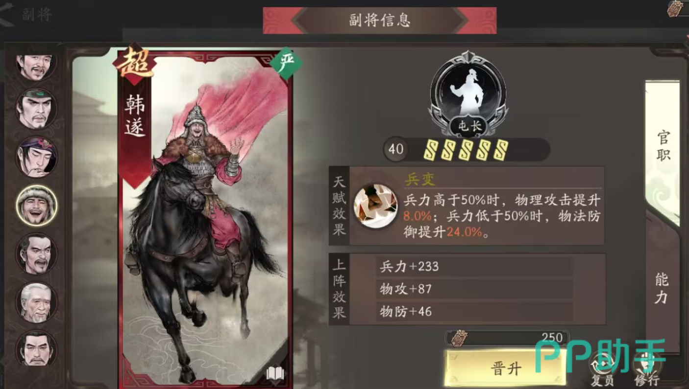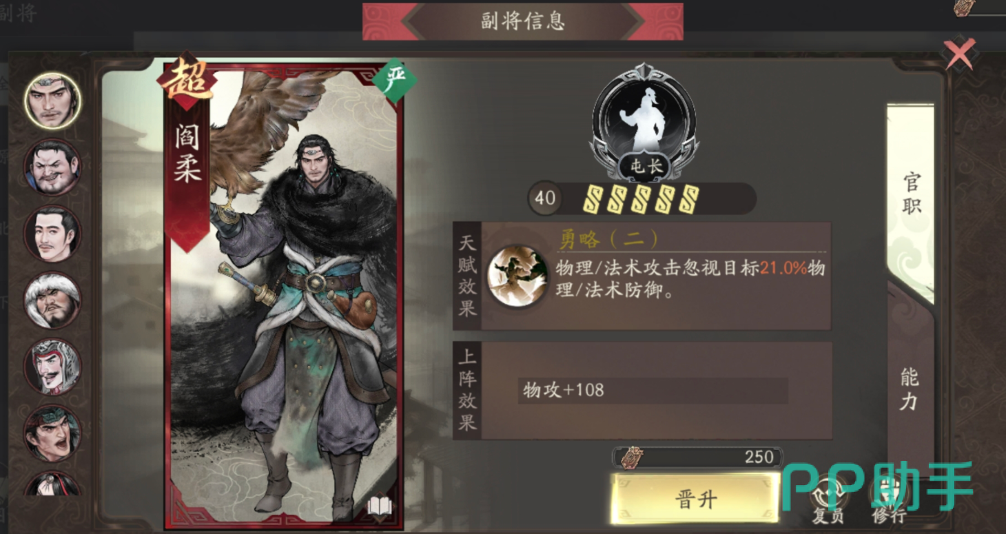 主将40级后开放双副将槽位,建议优先选择金色品质副将进行重点培养,因其拥有更高的成长潜力和更强的天赋能力,长期来看更具战略价值。