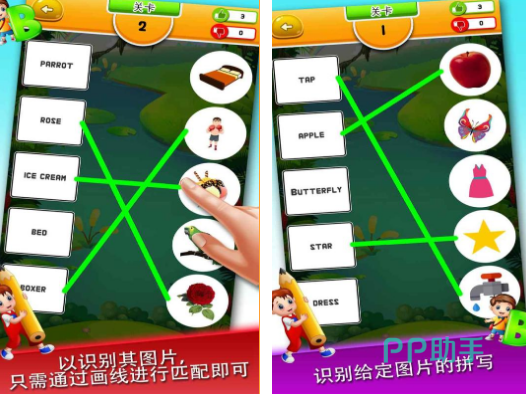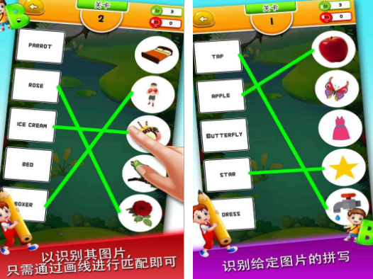 由于英文是需要打好基础的,所以对于儿童来说,在游戏的时候,也可选择寓教于乐的,比如这款通过对英文进行连线的方式,来学习英语的游戏,它就能帮助大家,通过趣味性的方式来,对英语产生浓厚的兴趣,而且还能提高在英语的拼写能力。有很多的图片以及单词,需要你在玩的时候,将图片对应的单词,正确连接以后就能通关。
