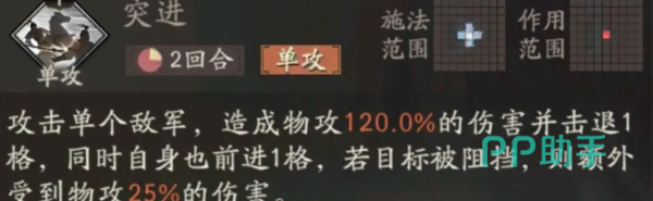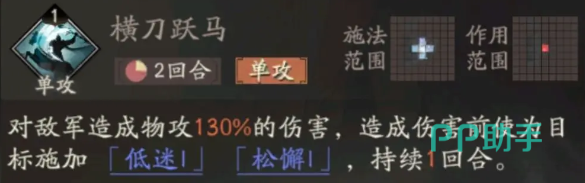 通用技能方面,“突进”是一项兼具位移与输出的强力技能,可对单个敌人造成130%物理伤害,并使其后退一格,同时夏侯惇向前推进一格。若目标被地形阻挡无法后移,则额外承受20%伤害。“铁马破阵”则能对周围一圈单位造成50%物攻的范围伤害,且对生命值低于50%的目标伤害提升50%。但由于该技能依赖密集站位才能最大化输出,实战中常因布阵问题难以发挥全部威力,因此使用频率相对较低。