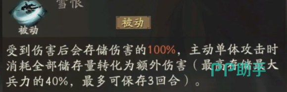 当前版本中,夏侯惇的核心玩法逐渐向“雪恨”被动靠拢。该机制允许他在受到伤害时累积等量伤害值作为能量储备。一旦发动单体攻击,即可消耗全部储存值转化为附加伤害,并依据消耗总量的35%恢复自身兵力,最高可存储相当于最大兵力40%的能量,且升级后可持续保留3个回合。这一机制使夏侯惇兼具爆发与回复能力,成为集反伤、续航与输出于一体的复合型战士。