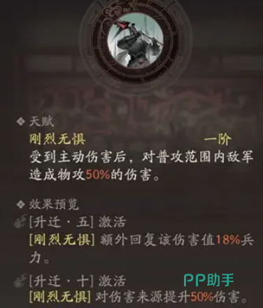 夏侯惇的核心天赋名为“刚烈无惧”,触发机制为:当自身受到主动伤害后,可对普攻范围内的敌方单位造成相当于50%物攻的反击伤害。若完成升迁,该效果还将额外提升18%兵力值。然而需要注意的是,这一被动在面对远程输出阵容时触发概率较低,限制了其发挥空间。因此建议玩家要么不投入过多资源培养,要么直接将其升至五星,解锁回血机制,从而大幅提升续航能力,使其真正成为战场上的坚盾利刃。