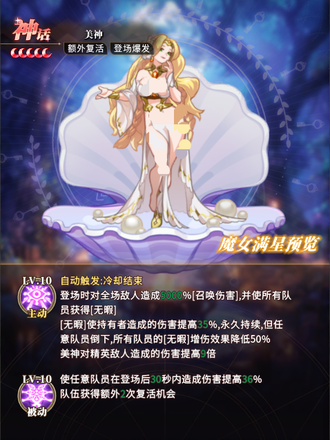 晴空双子美神是一位以团队增益与生存续航为核心定位的辅助型角色,其机制设计围绕“持续增伤”与“全队复活”两大支柱展开,在中长期战斗场景中表现尤为突出。角色形象兼具视觉张力与艺术质感,呈现为兼具力量感与神性气质的高辨识度女神造型。