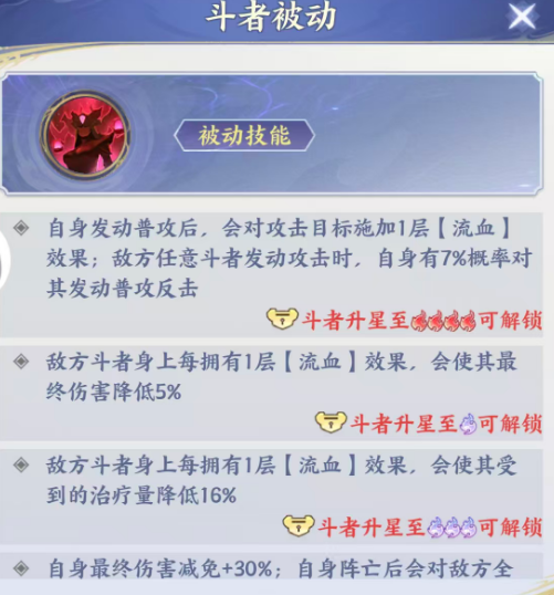 被动机制是其战术价值的关键所在。每次普攻命中后自动施加1层流血;当敌方任意单位准备发动攻击时,血河天尊有7%概率进行普攻反击。随着敌方身上流血层数增加,该反击还将同步触发双重压制效果:每层流血降低敌方对我方造成的最终伤害5%,同时削减其受到的治疗量16%。该设定显著限制了敌方治疗角色(如药老、云韵等)的支援效率。此外,被动升至满阶后,血河天尊自身获得30%最终伤害减免;阵亡瞬间,对全体敌人造成100%攻击力的爆发伤害,且若阵亡前已发动过普攻,则每1次普攻额外提升该终结技15%伤害,最高可叠加至90%增幅。