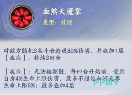 在技能设计上,血河天尊具备清晰的输出节奏:普攻为单体起手,而核心群攻技“血煞天魔掌”可对敌方随机三名目标造成80%攻击力伤害,并附加1层不可驱散流血状态。该状态持续3回合,每回合开始前,受击者将承受自身最大生命值4%的真实伤害(上限不超过血河天尊最大生命值的6%)。流血层数最高可叠加至4层,意味着满层状态下,敌人每回合将承受总计16%自身生命上限的持续真伤,极大压缩高血量单位的续航空间。