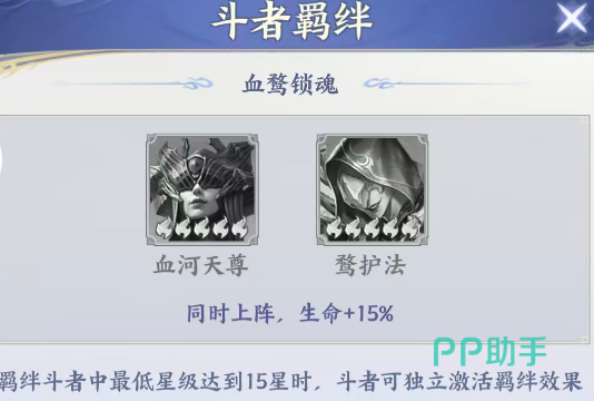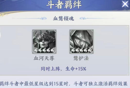 阵容搭配方面,血河天尊与鹜护法存在专属羁绊“血鹜锁魂”,激活后双方均可获得15%生命加成。该羁绊在角色未达15星前需双人同时上阵方可生效;当任一羁绊成员星级达到15星后,则可独立触发效果。因此,在中前期资源有限阶段,优先凑齐这对组合,能显著提升队伍整体容错率与持续作战能力。
