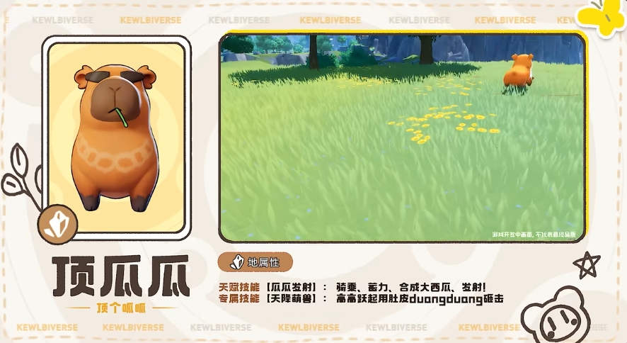 在游戏中,顶瓜瓜具备两项特别引人注目的技能,首先是专属技能“天降萌兽”,当激活此技能时,他会以惊人的速度跳跃至空中,随后利用自己柔软而富有弹性的大肚皮对敌人造成沉重打击。