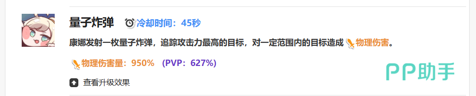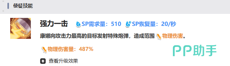 康娜的一技能为“强力一击”,释放后会锁定敌方攻击力最高的单位进行精准打击,通常针对的就是对方的核心输出角色。该技能不仅具备高额物理伤害,还能触发特殊炮弹效果,造成范围性打击,基础伤害倍率高达487%。这一特性使得她在面对高威胁目标时具备极强的压制力。