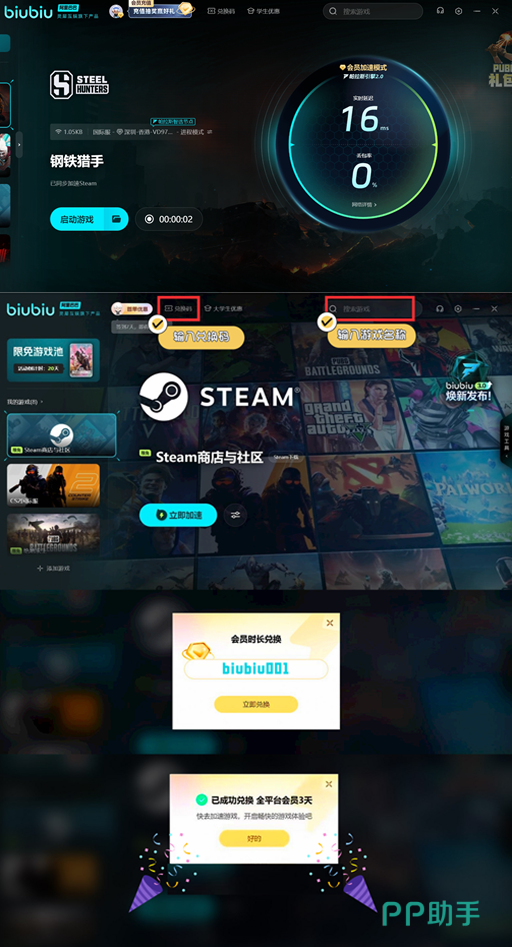 如果用了以上的方法还没有解决,还可以考虑一下网络的问题,网络延迟也会造成闪退等现象。建议选择一个加速器,biubiu加速器如今还会有免费加速时长可以领取,新用户在首次注册之后有一个3小时的免费加速时长。要想延长加速的时间可以输入兑换码【biubiu001】兑换72小时,两者放在一起一共是免费75小时。