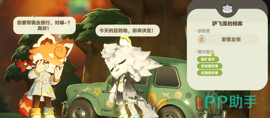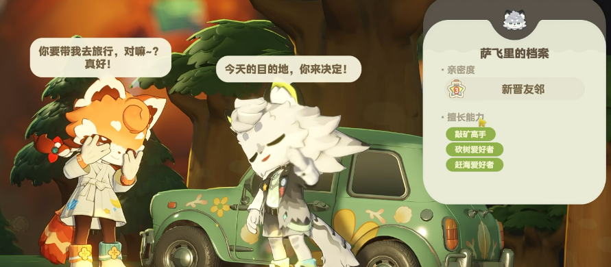 当与萨飞里的亲密度达到1级或2级后,玩家便可邀请他在自己的房屋附近建造居所,进一步深化互动。此外,在星海探索过程中,携带萨飞里出行可获得挖矿、钓鱼和砍树三项基础资源采集能力的增益加成,极大提升效率。