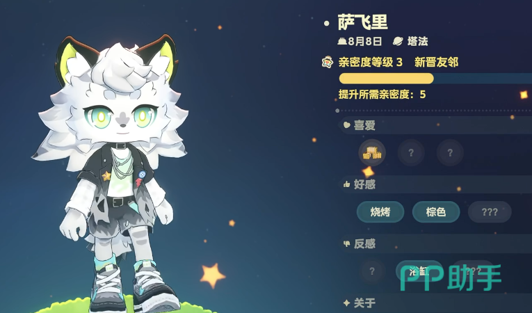 萨飞里来自塔法星球,生日为8月8日,星座为狮子座,性格外向且富有领导气质。在喜好方面,他偏爱烧烤类食物以及棕色系物品,对浴缸则表现出明显的反感。玩家若想快速提升与他的好感度,可通过赠送符合其喜好的礼物来实现高效互动,从而加快关系进展。