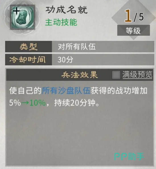另一项值得投资的兵法为“功成名就”。该技能能够显著加快战功获取速度,适用于频繁参与战斗的玩家。前中期通过大量参战快速积攒战功,有助于在中后期冲击排行榜名次,从而获得更多奖励与战略优势。对于追求双榜排名并注重长期发展的玩家来说,“功成名就”具备极高的实用价值。