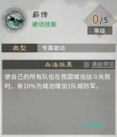 此外,“薪传”是一项具有战略延展性的兵法,可在战斗失败后触发,生成一队城防军用于拖延敌方进攻进度。虽然这支临时部队不具备强反击能力,但足以延缓敌人推进速度,为主城重建防线争取时间。对于缺乏强力反打手段的平民玩家来说,除非处于绝境翻盘情境,否则不建议优先投入资源培养该技能。