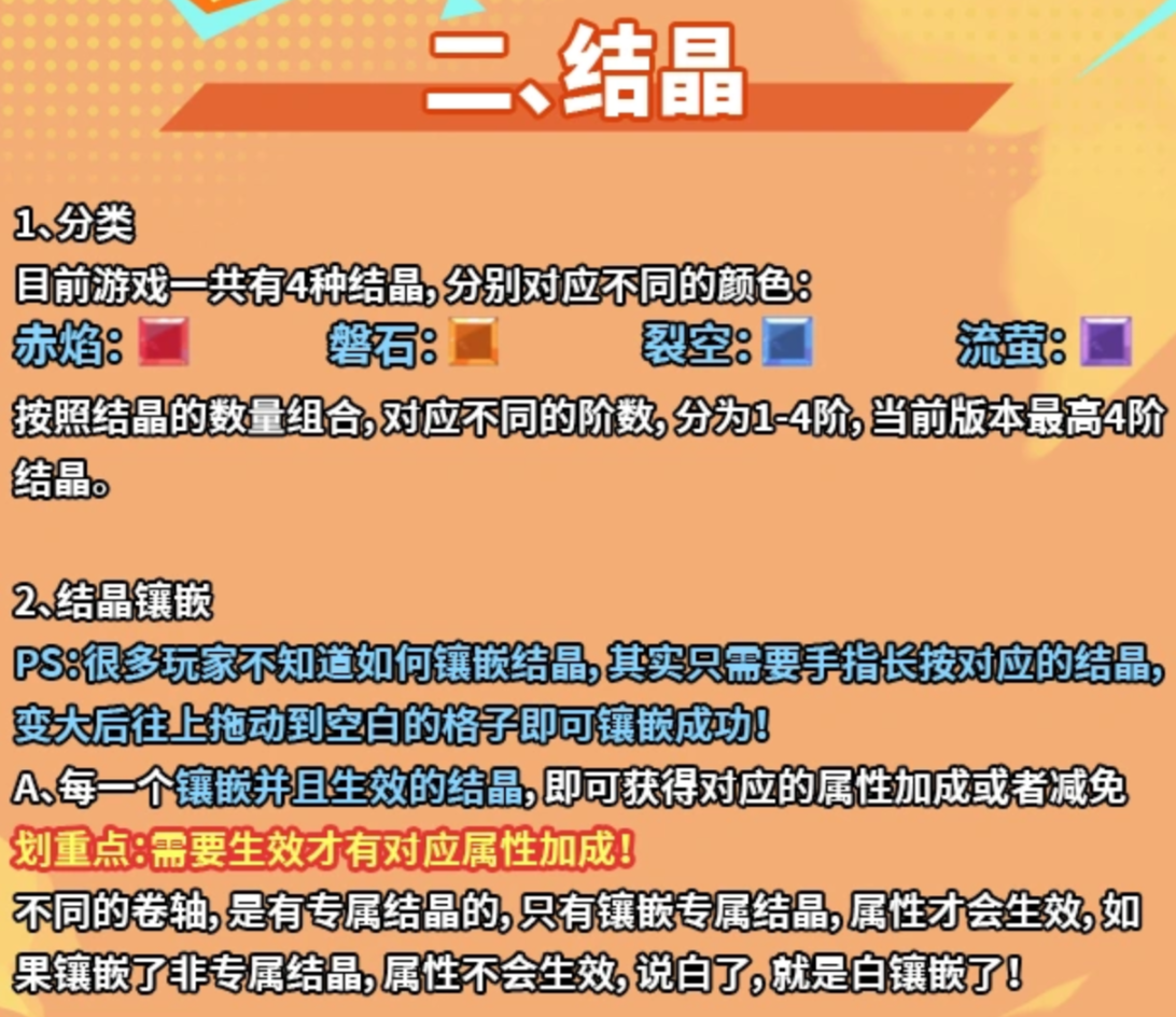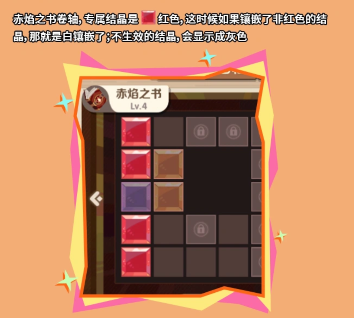 结晶镶嵌是魔法卷轴系统的核心操作环节。赤焰、磐石、裂空、流萤四色结晶均设有1至4阶完整成长路径。每类卷轴仅支持对应颜色结晶激活属性,例如赤焰之书仅识别红色赤焰结晶;若误嵌其他颜色结晶,属性将显示为灰色且完全失效,即“白镶嵌”。玩家需长按结晶拖入目标格位,并在释放前确认色系匹配,避免资源浪费。