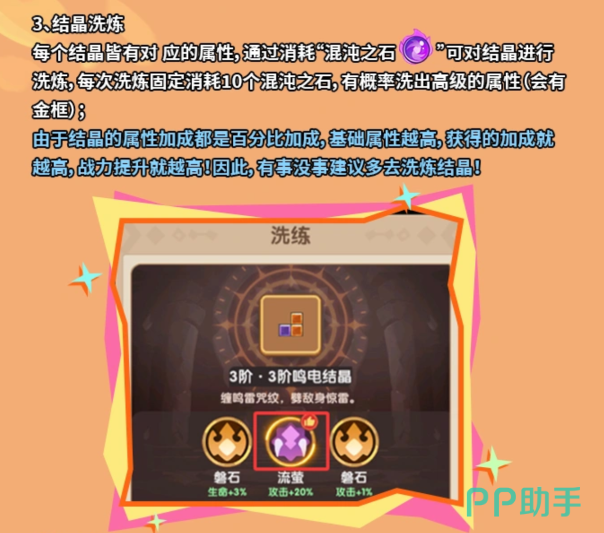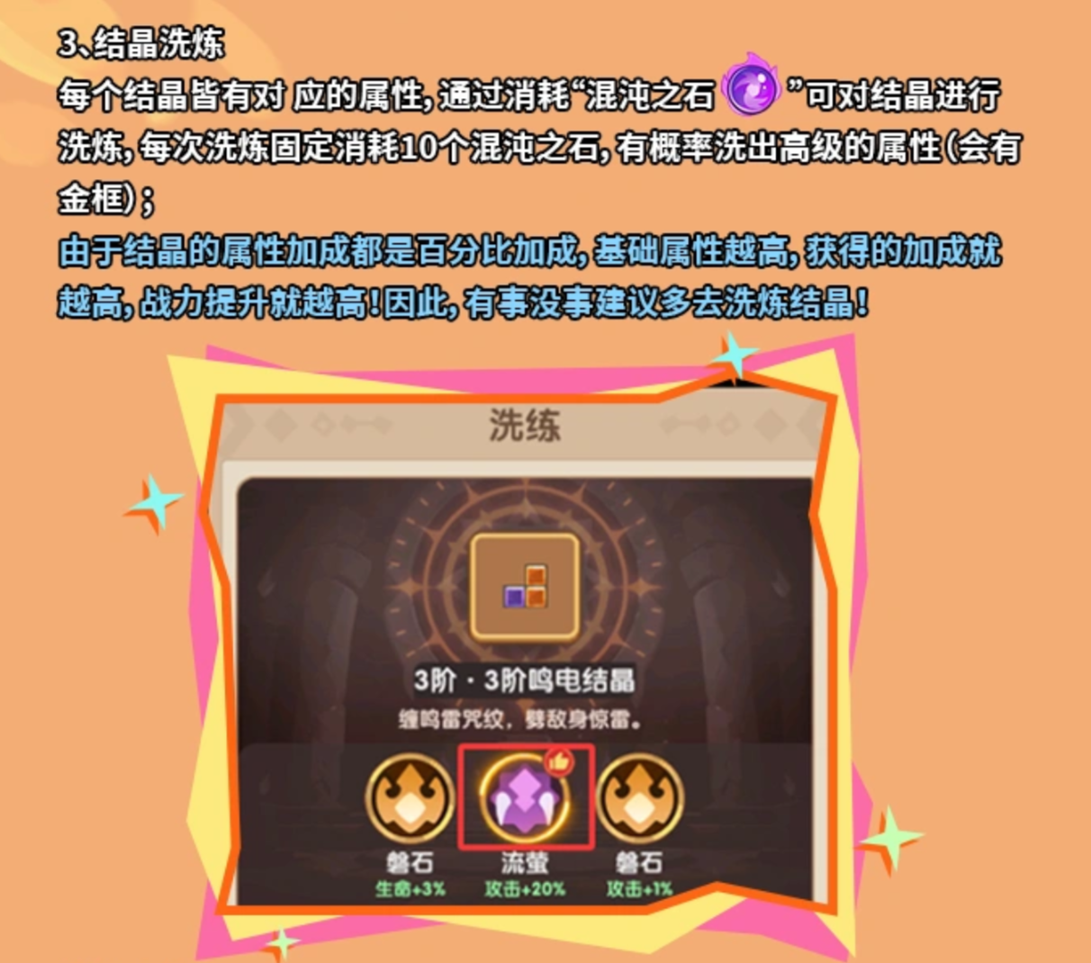 为获取最优属性配置,洗炼与融合不可或缺。使用混沌之石进行洗炼,单次消耗10枚,可随机重置结晶基础属性,触发金框标识代表获得高价值词条;因所有加成均为百分比计算,初始属性基数越高,最终战力提升幅度越显著。融合操作需投入三枚同阶结晶,有概率升阶或产出同色高阶结晶。特别提示:进行融合前务必取消勾选已培养的纯色结晶,防止误操作导致稀有资源损毁。